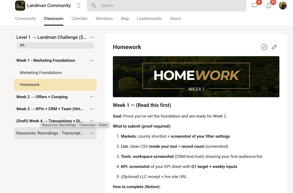 Homework is submitted and reviewed inside the community each week.