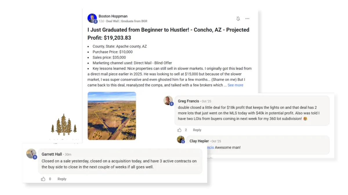 | Private Operator Community | Dozens of active land investors. Not beginners asking basic questions — operators doing deals, sharing markets, referring buyers. | $5,000/yr |